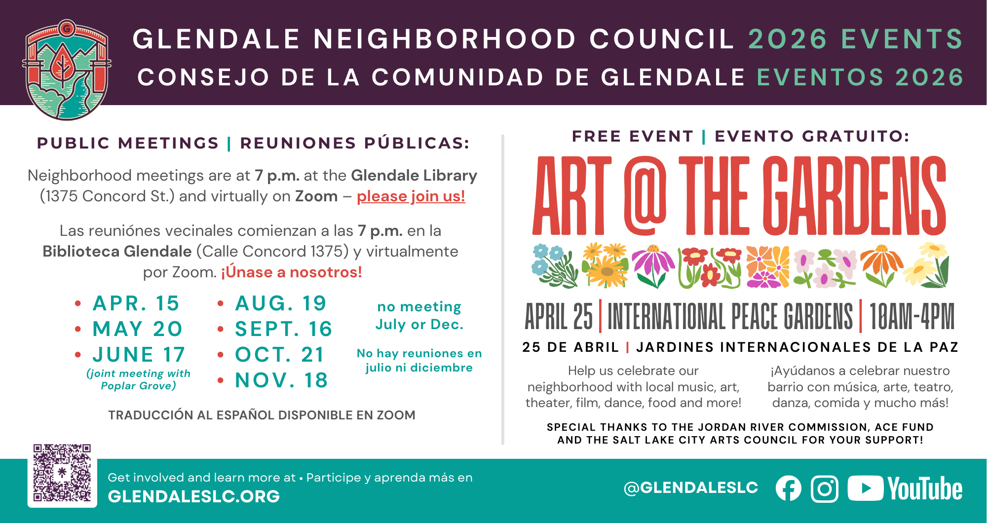 The Glendale Neighborhood Council is an elected group of residents dedicated to ensuring that those who live in Salt Lake City’s Glendale neighborhood have access to news, resources, and events that affect our local community.