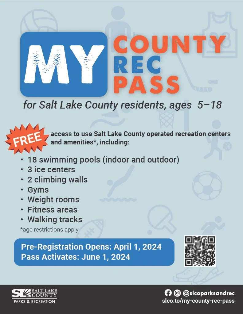 Thanks to the support of Mayor Wilson, Salt Lake County Council, and the Tourism, Recreation, Culture, and Convention program, Salt Lake County Parks and Recreation is piloting the My County Rec Pass for youth in 2024.
